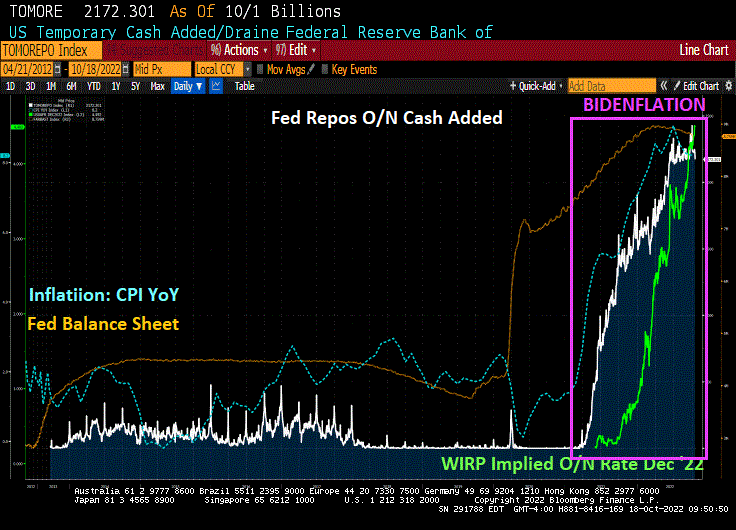 As Bidenflation soars, and The Fed counterattacks, we see Fed’s repo market remains elevated. Note that The Fed’s balance sheet (orange line) is only slowly being reduced.