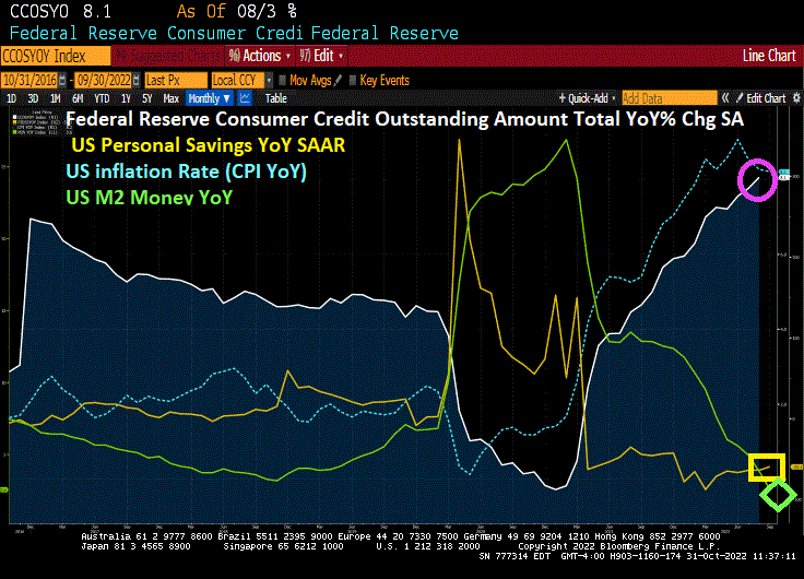 Consumer credit outstanding soared by 8.1% YoY in August as the inflation rate soared to 8.2%. Meanwhile, the personal savings rate YoY cratered to -59.3%.