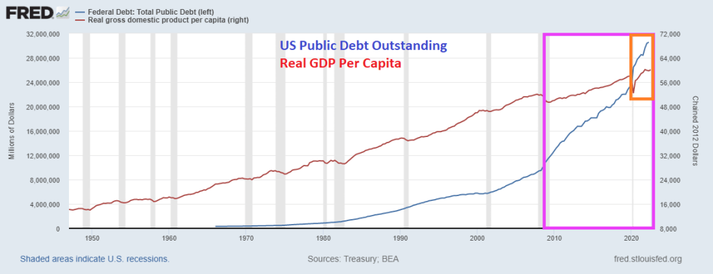Or how about this chart of US Public Debt Outstanding and Real GDP growth per capita? The Fed and Federal government broke the bank, so to speak, by bailing out the banks in the financial crisis (pink box) and then again for the Covid crisis (orange box). Janet?