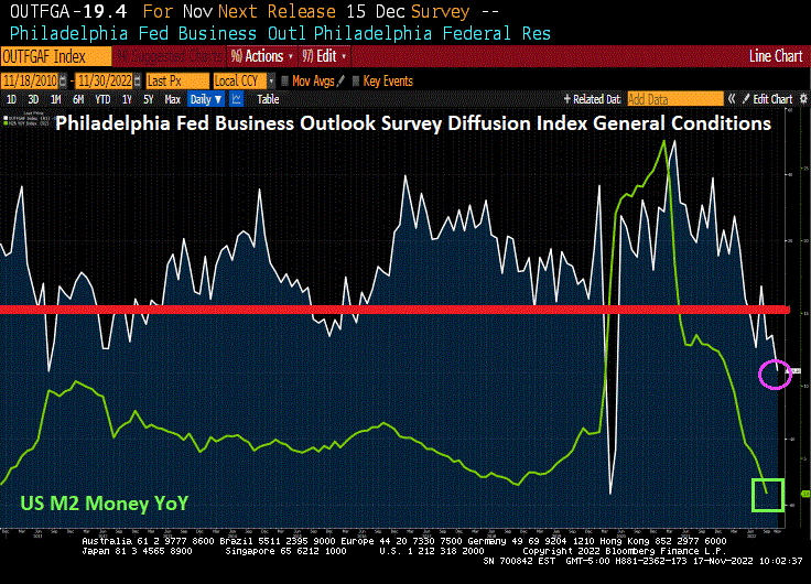 The Philadelphia Fed’s Business Outlook plunged to 1-9.40% YoY, the worst since 2012. Notice how the Philly Phed Plunge is related to M2 Money growth YoY.
