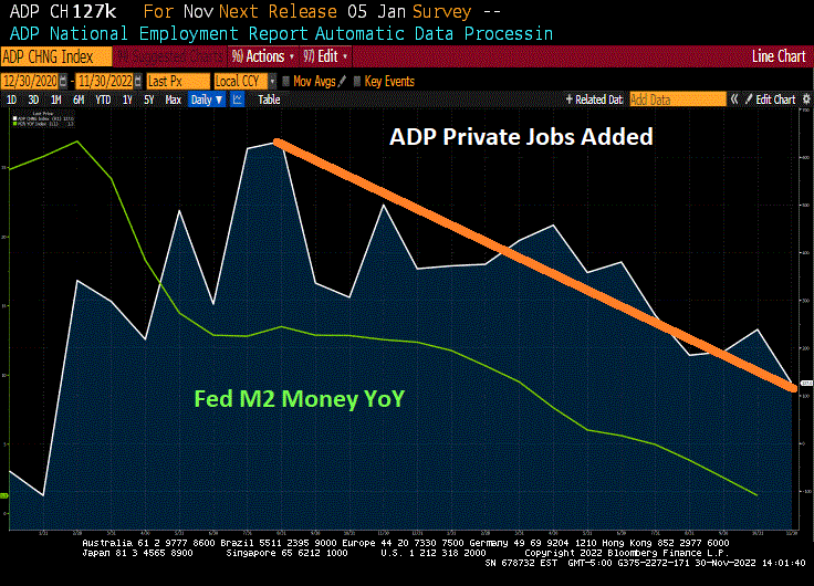 ADP’s jobs added in November shows a continued downward trend in private jobs added as The Fed merrily tightens its monetary follicy.
