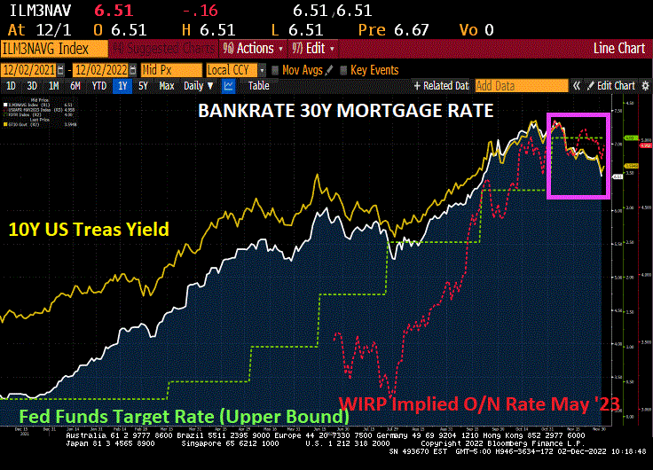 Mortgage rates fell to 6.51 yesterday, but expectations of Fed rate hikes (WIRP) and the 10-year Treasury yield are up today. In fact, the 10-year US Treasury yield is up 10 basis points this morning. This will likely translate to higher mortgage rate today.