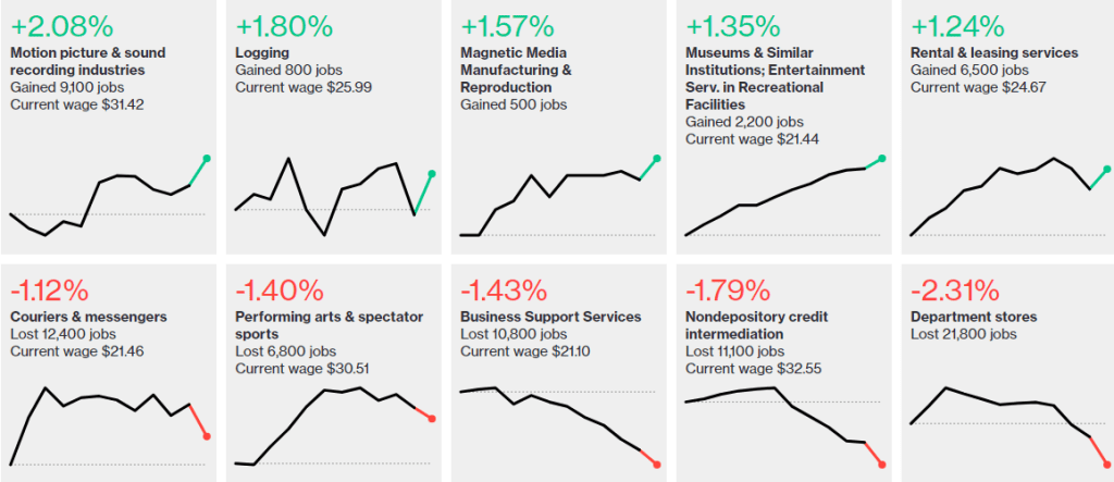 The biggest gainer? Motion picture and sound recording industries followed by logging (with rising energy prices, people have to heat their homes somehow).