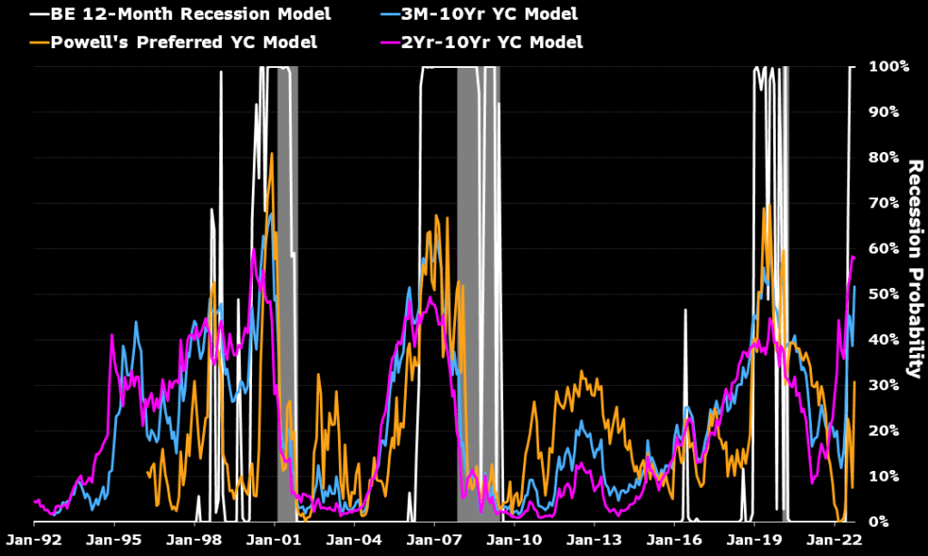While various measures of impending US recession show a good chance of a 2023 recession, Powell’s preferred measure of the yield curve shows only a 30% chance.