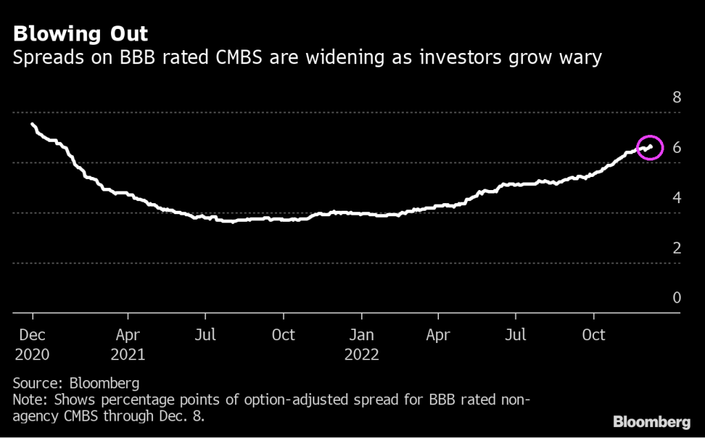 That may be why spreads on BBB commercial mortgage bonds have widened by about 2.7 percentage points this year through Thursday to around 6.6%, for the securities without government backing. They are now at their widest since January 2021. They’ve been getting hit particularly hard in the last few months, even as risk premiums on investment-grade and high-yield corporates have been shrinking on hopes the Federal Reserve will scale back its tightening campaign.