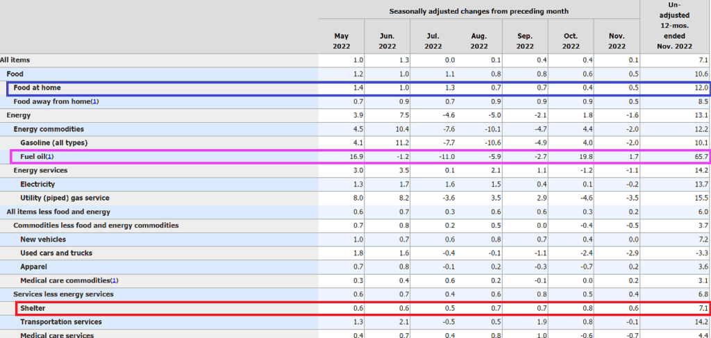 The biggest losers in the inflation report for November? Food at home up 12% YoY, Fuel Oil up 65.7% YoY and “shelter” up 7.1% YoY. I call this the household bundle … of pain.