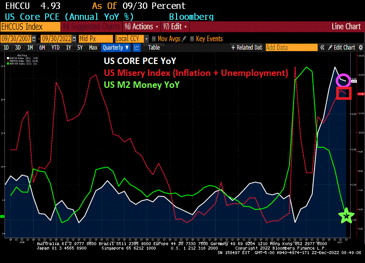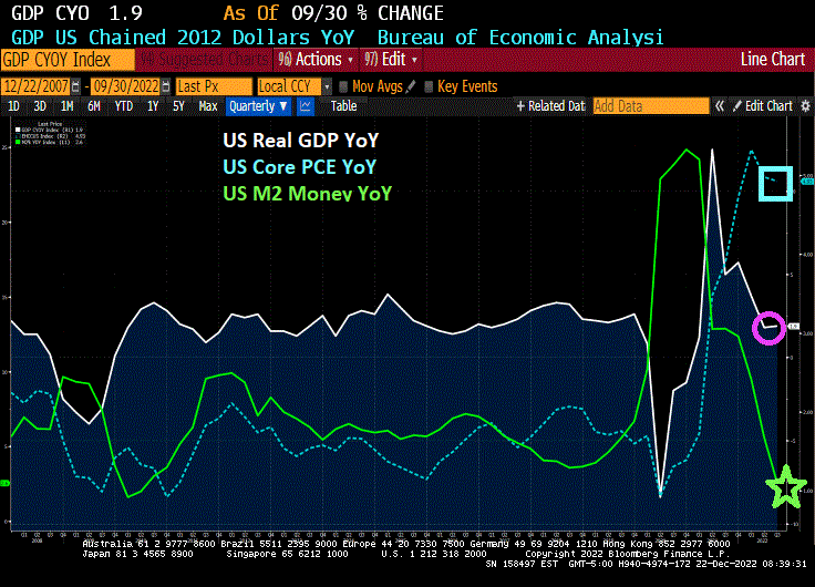 On a year-over-year (YoY) basis, US real GDP rose to a measly 1.9%. US core PCE YoY fell slightly to 4.93%. M2 Money growth is at 2.6% YoY.