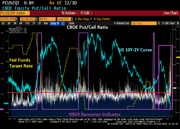 But another indicator of “all is not well” is the CBOE Put/Call Ratio. Typically, the Put/Call Ratio spikes during a recession. But on December 28, 2022, the Put/Call Ratio spiked to its highest level since 1996. Although it has calmed down to 0.84 on December 30, 2022. Suffice it to say that there is enormous uncertainty in markets.