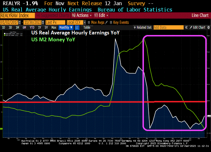 Thanks to inflation, US workers have had 20 consecutive months of negative wage growth. But as M2 Money growth slows to a halt, so will real average hourly earnings.