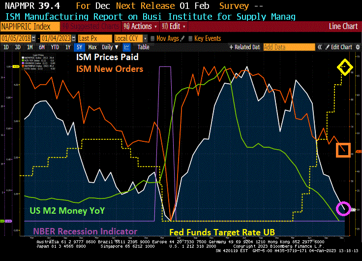And with it, ISM Manufacturing Report for December is showing weakness. New orders (orange line) is down to 45.2 (below 50 is contraction) and the prices paid is down to 39.4 (white line). All this is happening as The Fed raises its target rate (yellow line) and removes monetary stimulus (green line).