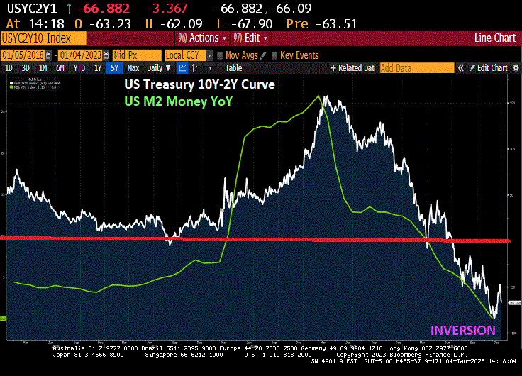 Speaking of Already Gone, look at the US Treasury 10Y-2Y yield curve with slowing M2 Money growth. Yield curve inversion is more about vanishing M2 Money growth than it is a forecast of recession.