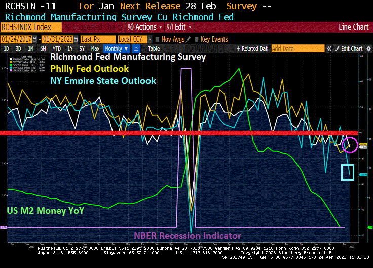 Three regional Fed reports I like to watch are New York’s Empire State Outlook, Philly Fed’s Outlook and Richmond Fed’s outlook. Today, The Richmond Fed released their manufacturing outlook and … it declined to -11.