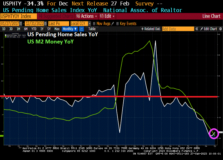 Pending home sales declined -34.4% year-over-year (YoY) as M2 Money growth went negative (-1.3% YoY).