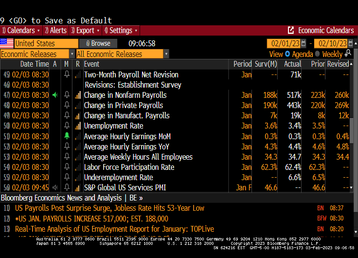 Today’s jobs report from the Bureau of Labor Statists (BLS) was stunning. 517k jobs added! Very strange since the ADP jobs added report on Febuary 1st was only 106k. THAT is a huge discrepancy (probably a seasonal adjustment in the BLS reporting).