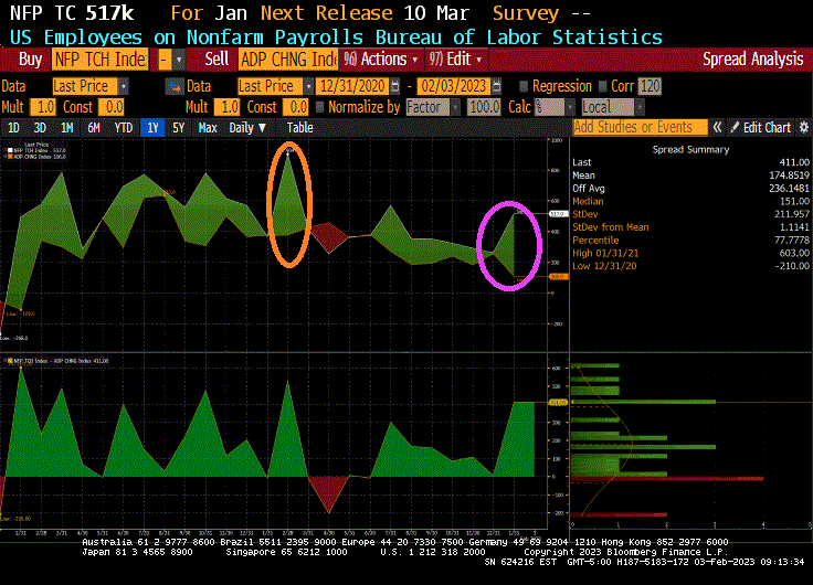 The spread between the January jobs report (BLS) and the ADP jobs added report (ADP) is similar to the infamous jobs report that the Philly Fed “corrected” (orange circle).