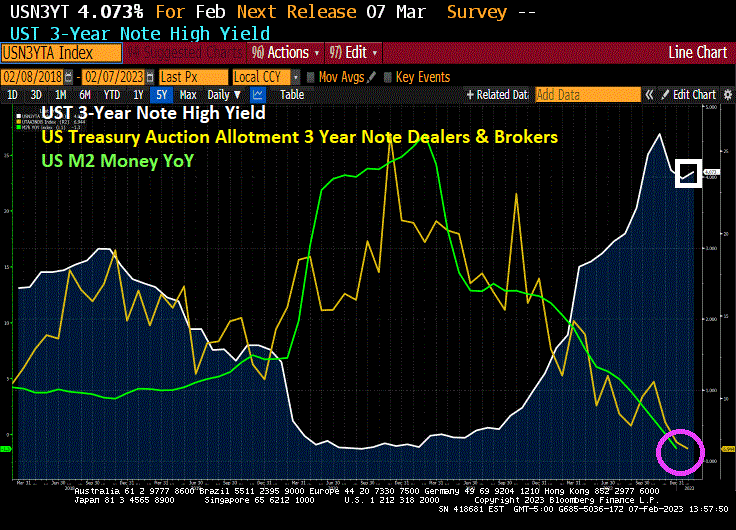 First, the high yield at today’s auction of 3-year Treasury notes was 4.073%. This occured as the allotment to brokers and dealers collapsed along with M2 Money growth YoY.