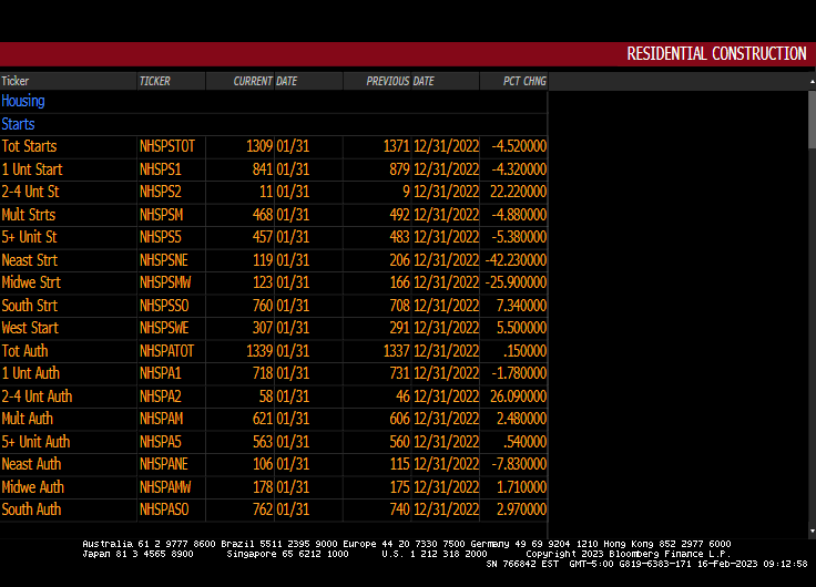 First, US housing starts are now down -21.4% year-over-year (YoY) and down -4.5% month-over-month (MoM) in January 2023 as The Fed removes its massive monetary stimulus.