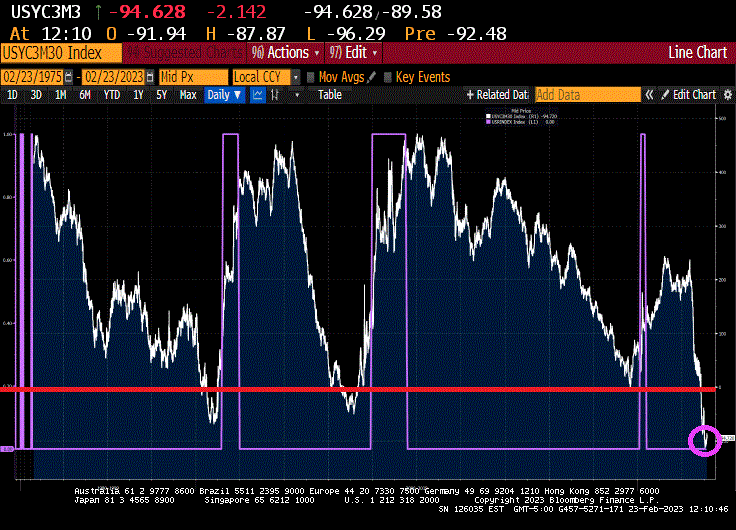 Bull steepenings in the yield curve are generally seen as a precursor to a recession, but they are often preceded by bear steepenings. The 3m30y curve is currently bear steepening, indicating a recession could begin as early as the summer. In fact, the 3m30y curve is now inverted at -94.628 basis points pointing to a recession in summer 2023.