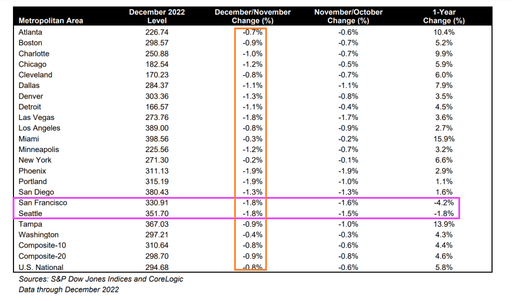 Only Seattle and San Francisco experienced negative growth in home prices on a year-over-year basis. All of the top twenty metro areas experience negative month-over-month price declines from November to December.