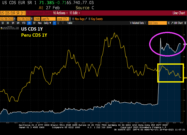 I used to write that the US is fast becoming Venezuela or Argentina. But its now official — the US has greater default risk than Peru!