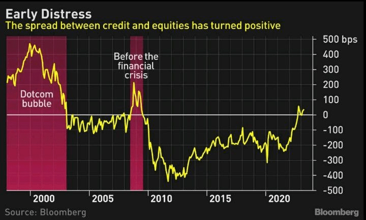 Another sign of distress is the spread between credit and equities which has turned positive as it does in times of crisis.