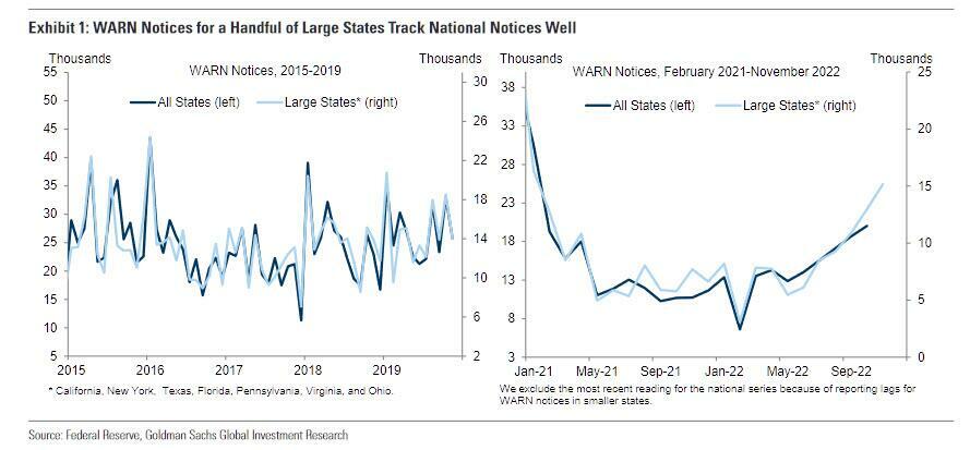 On top of the dismal revision to the Q4, we are seeing WARN notices increasing, particularly for large states. Worker Adjustment and Retraining (WARN) Notices are picking up which points to unemployment claims soon rising and a deterioration in the jobs market, posing a risk to stocks.