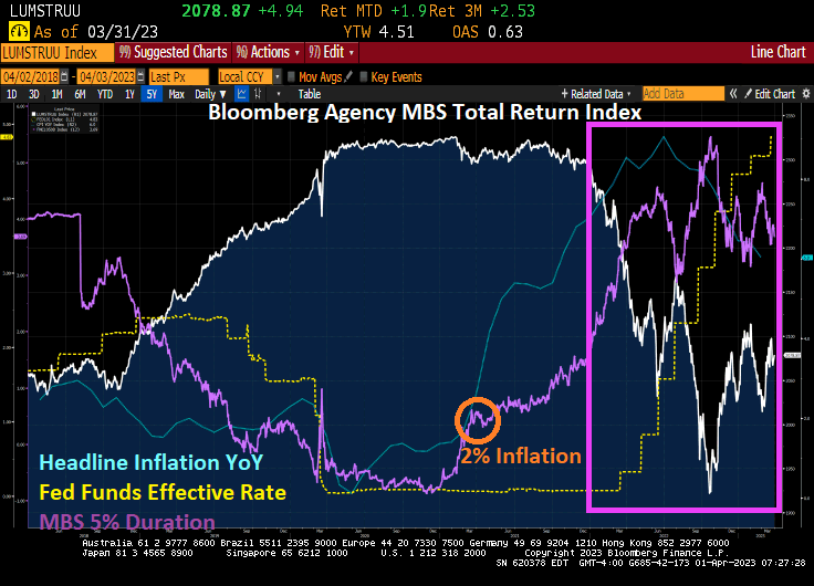 The result? Agency mortgage-backed securities (MBS) got clobbered (white line) as MBS duration (purple line) rose dramatically. Duration is the weighted-average life of MBS and is a measure of risk.