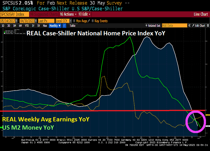 The February Case-Shiller National home price index less core inflation (CPI less food and energy) year-over-year is declining by -3.5%. This is happening as REAL average weekly earnings growth is at -1.06% YoY and has been negative growth for 25 straigth months.