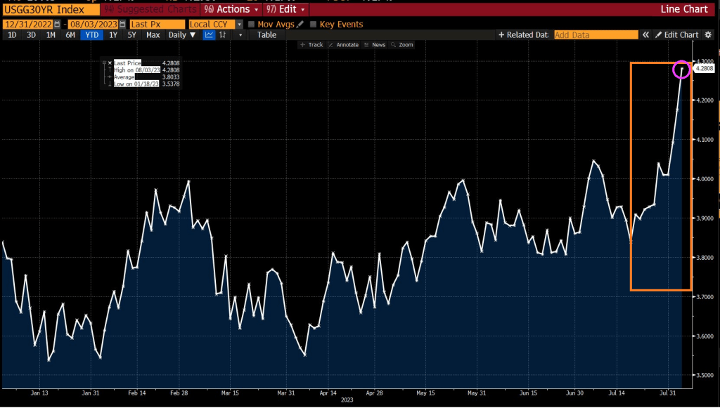 It’s been a tumultuous week for yields, with the Bank of Japan’s policy tweak, and the Treasury increasing its funding needs. But Fitch was the weatherman with its US downgrade, telling us about the downpour we can see for ourselves just by taking a glance at the fiscal data. In short, the US faces a perfect storm of a vertiginous fiscal deficit, a near-historically swollen debt load, ballooning interest-rate costs and collapsing tax revenues.