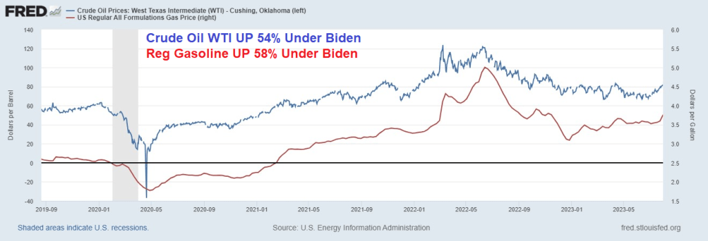 While Biden/Granholm are merrily draining the Strategic Petroleum Reserve, we see that West Texas Intermediate Crude Oil (Cushing) prices are up 54% under Biden and regular gasoline prices are up 58%.