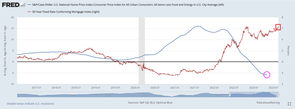 But REAL home price growth (Case-Shiller National HPI YoY – Core CPI YoY) has been declining as The Fed helped jack up mortgage rates above 7%. REAL home price growth was last reported as -5.8% YoY.