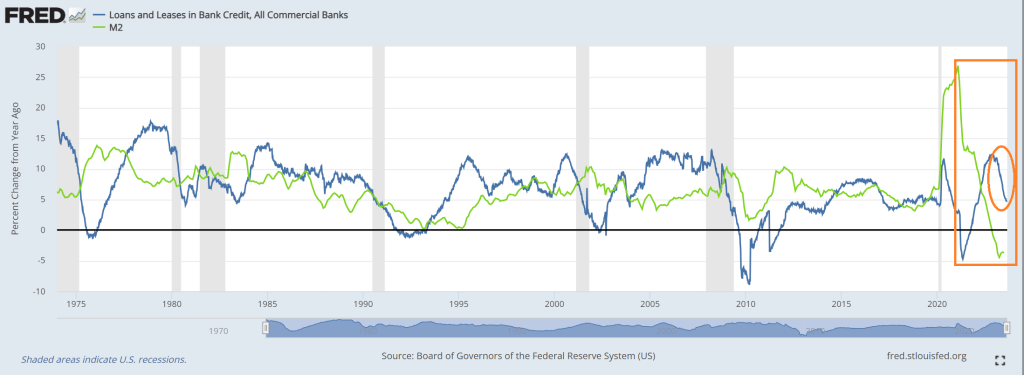 For example, look at this chart of loans and leases at commercial banks, since last year (YoY). The growth rate is plunging rapidly. Of course, M2 Money growth has already crashed.