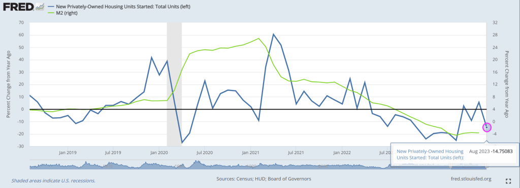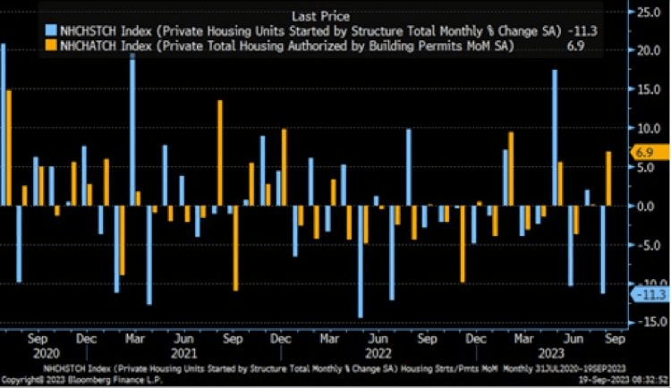 Single‐family housing starts in August were at a rate of 941,000; this is 4.3 percent below the revised July figure of 983,000. The August rate for units in buildings with five units or more was 334,000. This leaves Starts (SAAR) at their lowest since June 2020 and Permits (SAAR) at their highest since Oct 2022…