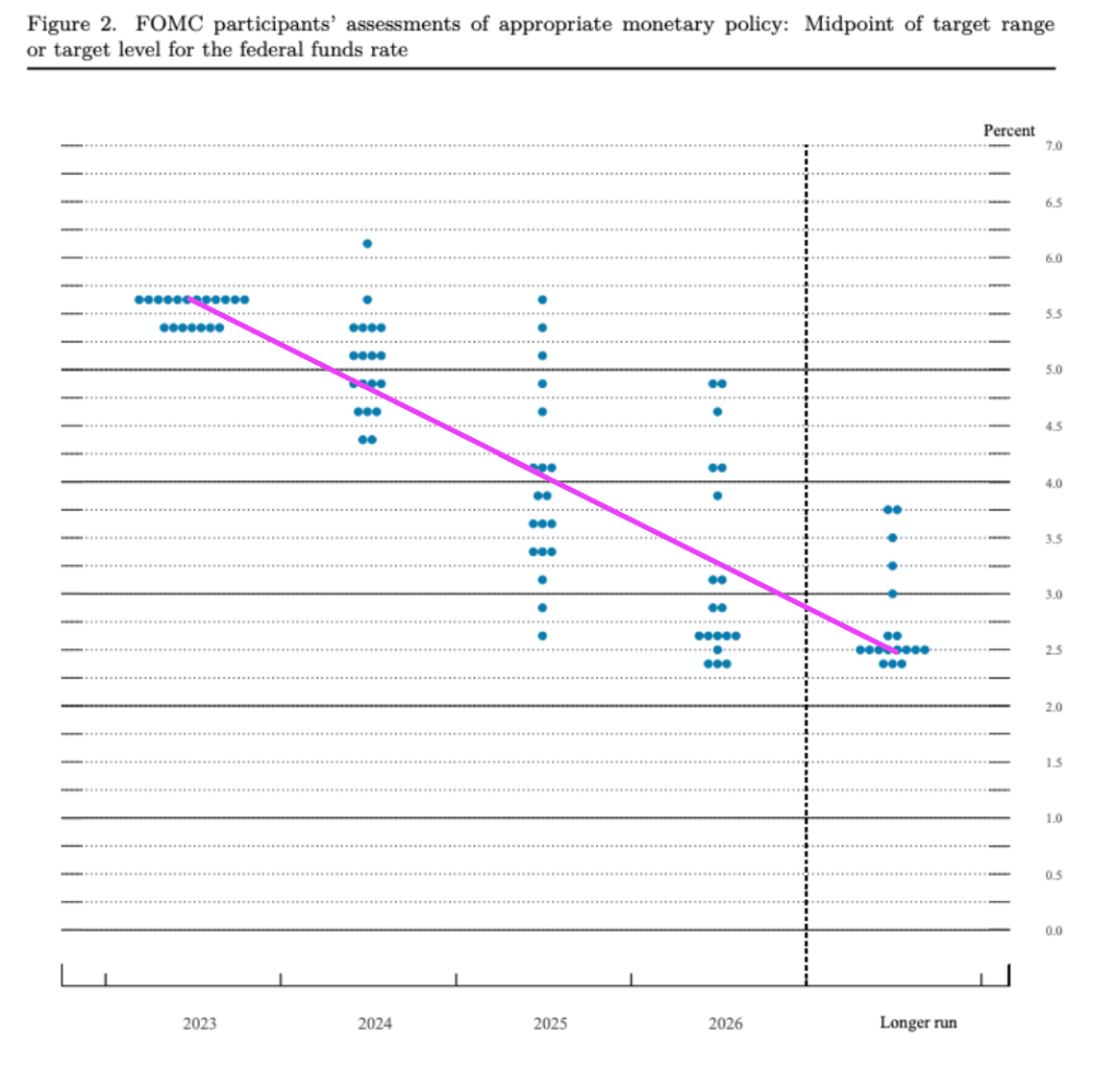 So much for The Federal Reserve raising rates until it gets inflation to 2%. Yesterday, the left their target rate unchanged. But yesterday, The Fed released their dot project showing their target rate is expected to decline in 2024 and beyond.