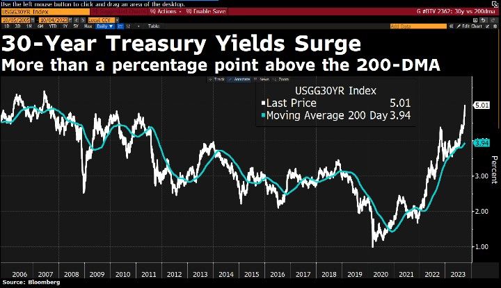 US Treasury yields are a runaway train. The 30-year Treasury yield is soaring and rose above 5% … again. First time since 2007, just before the financial crisis and The Great Recession.
