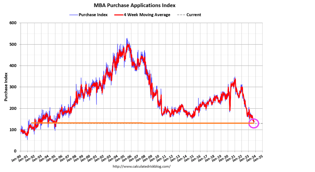 Mortgage applications decreased 6.9 percent from one week earlier, according to data from the Mortgage Bankers Association’s (MBA) Weekly Mortgage Applications Survey for the week ending October 13, 2023. Applications decreased to their lowest level since 1995, as the 30-year fixed mortgage rate increased for the sixth consecutive week to 7.70 percent – the highest level since November 2000.