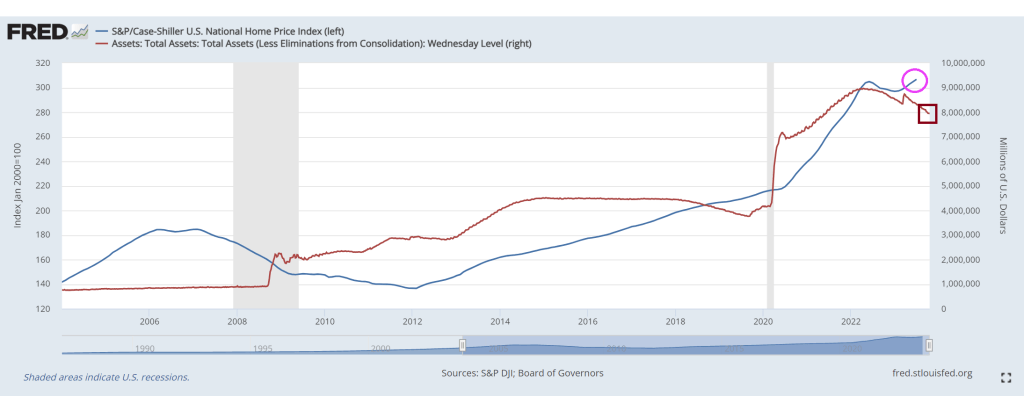 Inventory remains far below levels seen before the financial crisis. But Case-Shiller National Home Price Index (blue) remains elevated along with The Fed’s balance sheet (red) which is barely below $8 TRILLION. And Powell didn’t say much about speeding up the trimming of The Fed ballast.