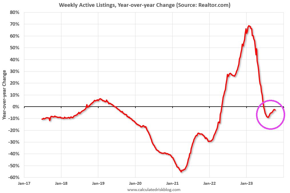• New listings–a measure of sellers putting homes up for sale–were down again this week, by 4.4% from one year ago. Since mid-2022, new listings have registered lower than prior year levels, as the mortgage-rate lock-in effect freezes homeowners with low-rate existing mortgages in place. Although the year over year declines are smaller now than the double-digit pace seen earlier in 2023, declines from the pre-pandemic period are still substantial.