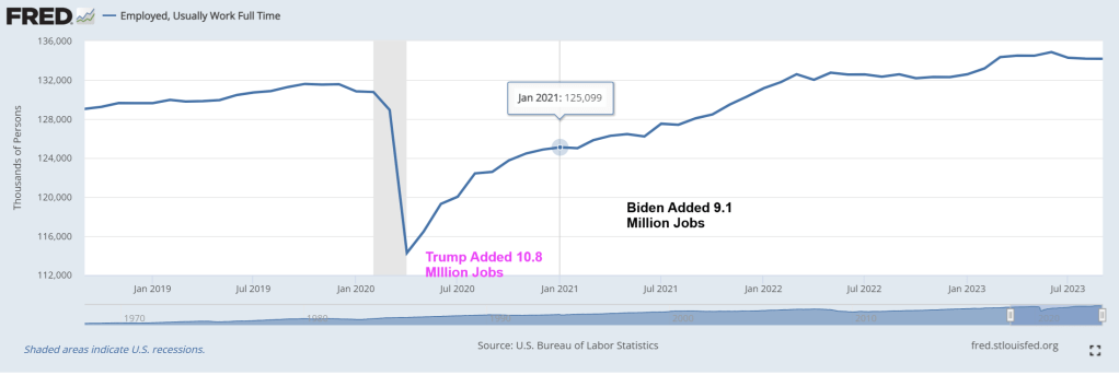 After the Covid outbreak and the government shutdowns (causing a recession), 10.8 million jobs were added under Trump simply by allowing local economies (and schools) to open again. Thanks to ridculous changes in voting laws because of Covid (e.g., online and mail-in ballots), Trump lost the election to Biden. Since Biden’s swearing in, the economy almost 3 three has added 9.1 million FULL-TIME JOBS.