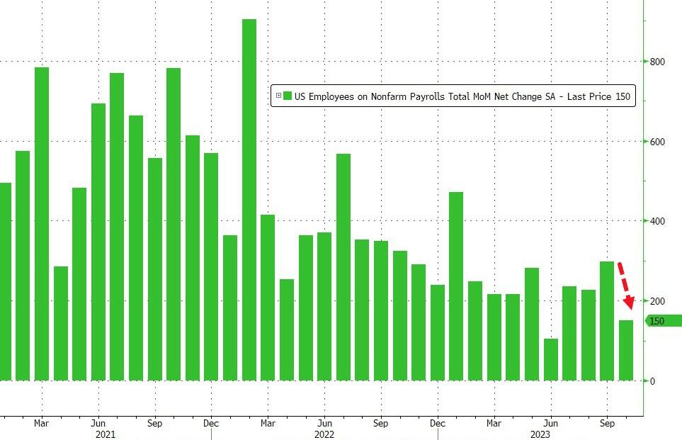 Total nonfarm payroll employment increased by 150,000 in October, below the average monthly gain of 258,000 over the prior 12 months. This represents a drop of more than 50% from the original Sept print, and the second lowest since 2022!