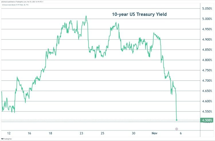10-year US Treasury yield now down a whopping 40 basis points in the last three trading sessions.
