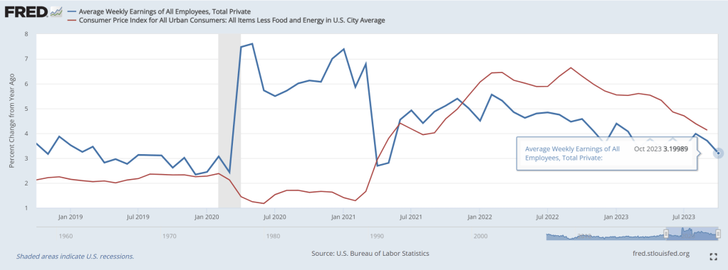 Average weeky; earnings growth YoY slowed to 3.2%. Too bad core inflation last printed at 4.13% YoY in September.