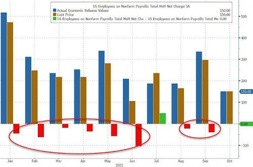 As usual, historical data was revised massively lower, with the jobs change for August revised down by 62,000, from +227,000 to +165,000, and the change for September was revised down by 39,000, from +336,000 to +297,000. With these revisions, employment in August and September combined is 101,000 lower than previously reported. In total, 8 of the past 8 months have been revised sharply lower in what only idiots can not see is clearly mandated political propaganda designed to make the economy look stronger at first glance then quietly revise the growth away.