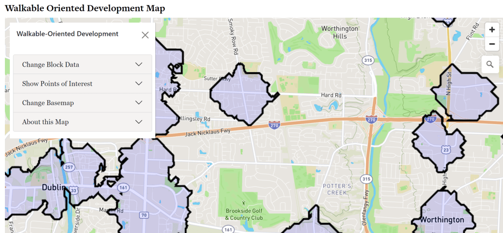 As an example, I live in Columbus Ohio. Here is a map of my neighborhood. The gray areas are walkable areas. Although Sawmiill Road (70) is shown as a walkable area, I have NEVER seen anyone walking on Sawmill Road. Traffic is congested and it is primarily a large, disconnected outdoor shopping mall). My neighborhood is on this map, but according to AEI is not walkable, yet I chose this neighborhood for its limited traffic and walkability. Go figure. I would purposefully avoid a walkable city, but them I like driving my ICE (internal combustion engine) car and riding my bike. Riding a bike on congeted Sawmill Rd would be suicide.