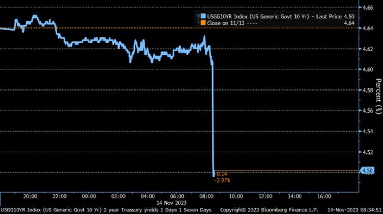 The 10-year Treasury yield cooled to 4.50% as investors see no further action from The Fed … at least until 2024.
