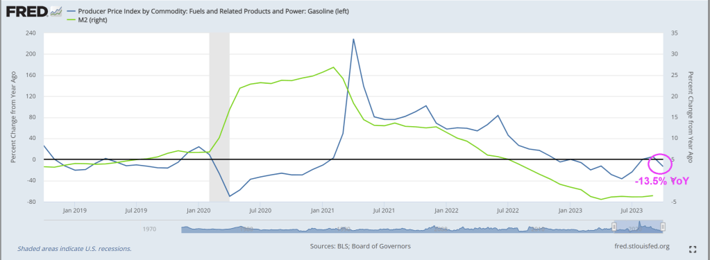 Gasoline PPI plunged -13.5% YoY in October. No it wasn’t Biden opening up America to energy indepence. More like the impact of M2 Money growth being negative.