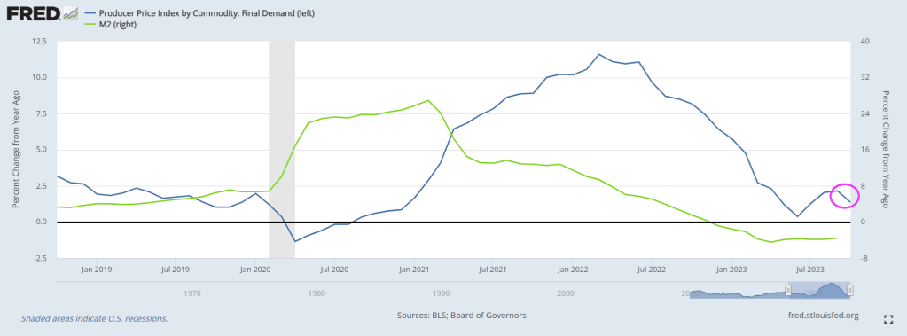 The other driver? M2 Money growth. Notice that PPI Final Demand is slowing as M2 Money growth goes negative.