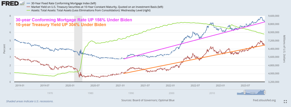 The US conforming mortgage rate (30Y) is up 156% under Biden while the 10-year Treasury yield is up 304%.