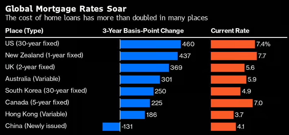 Global mortgage rates are soaring, much of due to central bank tightening after the Covid fiasco of 2020 as central banks try to reign in inflation caused by rampant government spending.