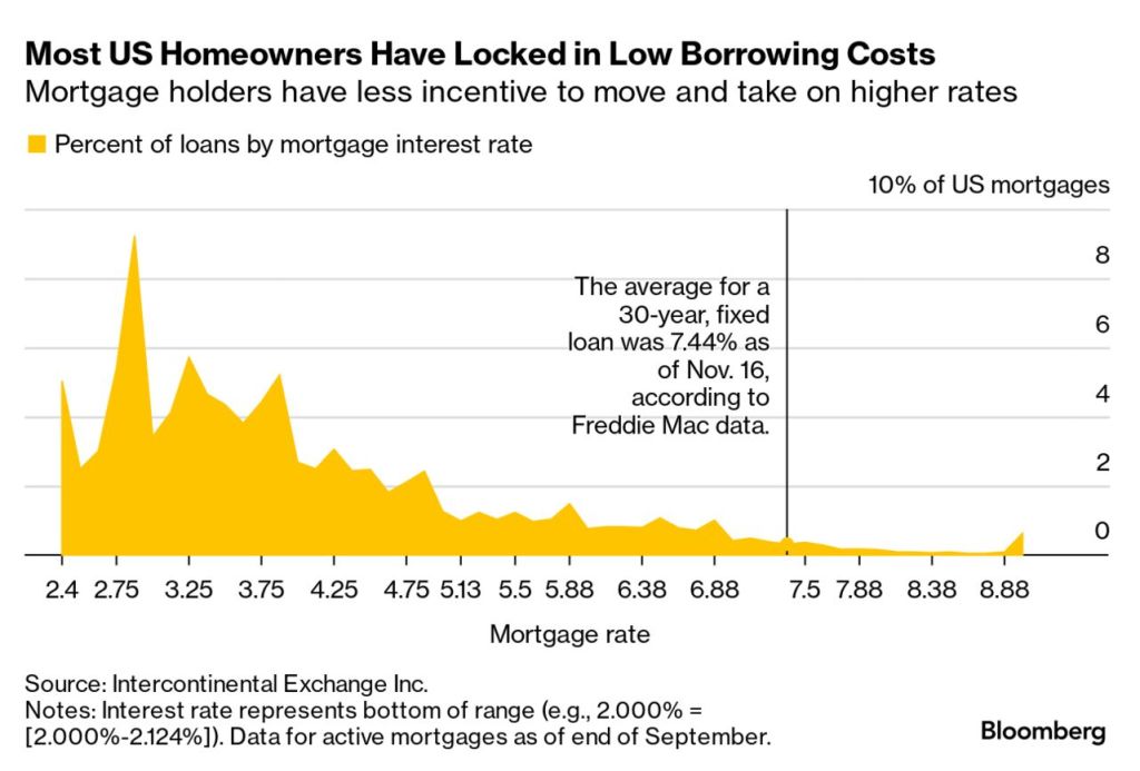 Most homeowners are now locked into low borrowing costs, which is hampering home sales.